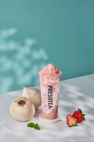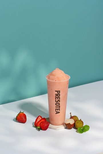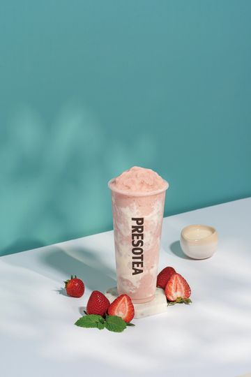 Blended fresh strawberry, strawberry puree, and creme, contains dairy